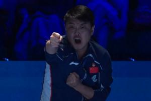 逆转取胜后,王楚钦单手指天庆祝,王皓指导激情挥拳庆祝。