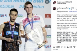 马来西亚羽毛球运动员李宗伟更新社媒,祝福了退役的安赛龙。李宗伟晒出两人合照,并配文写道:看着你从当年的追风少年,一步步成长为统治羽坛的巨人,作为老对手和老朋友,我深感欣慰,能和你共同拥有一段交集的职业生涯,是我的荣幸;你对羽毛球的自律、热爱以及你为这项运动带来的改变,所有人都看在眼里。