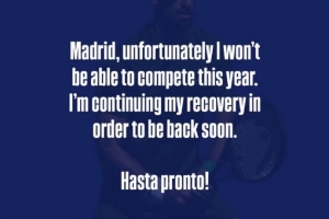 德约科维奇在个人社媒表示,自己将退出今年马德里大师赛,将继续康复,以尽快重返赛场。